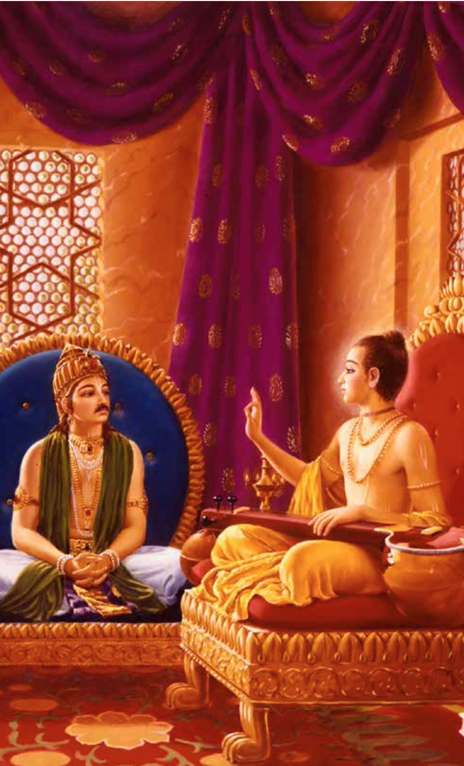 While performing their austerities, the Pracetas happily recited the prayers. Meanwhile, their father, King Pracinabarhisat, was engrossed in materialistic endeavours and oblivious to the spiritual dimension of life. The itinerant preacher, Narada Muni, arrived on the scene and resolved to philosophically enlighten the King through the allegorical story of Puranjana.