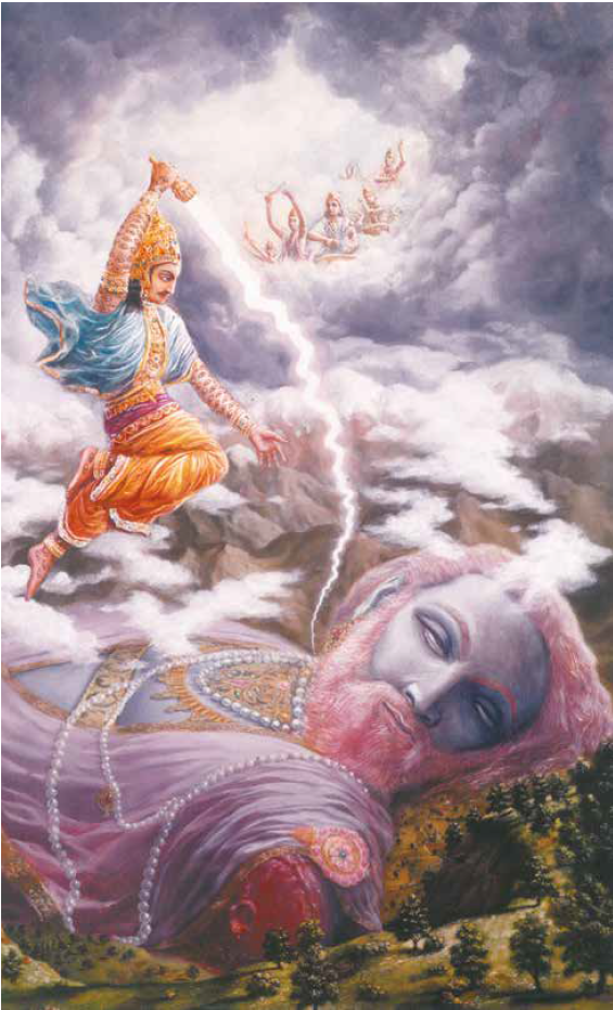 Vritrasura attacked again. Impressed with the demon’s devotion, detachment and knowledge, Indra heeded his advice. He thus invoked the thunderbolt and a great fight ensued. Indra eventually severed the demon’s head from his body with his powerful thunderbolt, an act which took one complete year to accomplish. Everyone cheered, while Vritrasura entered the transcendental world of Lord Sankarsana.